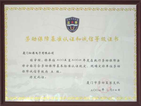 ●公司“2005~2006年被厦门市劳动监察大队评为劳动保障诚信等级A级企业”。