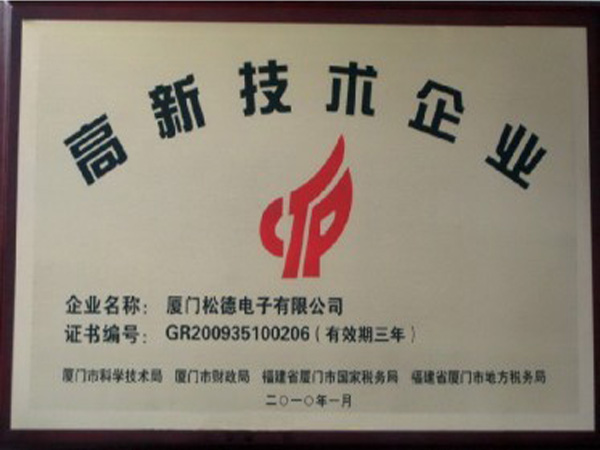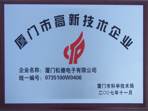 ●2007年被评为“厦门市高新技术企业”。2010年又被评为“国家高新技术企业”。
